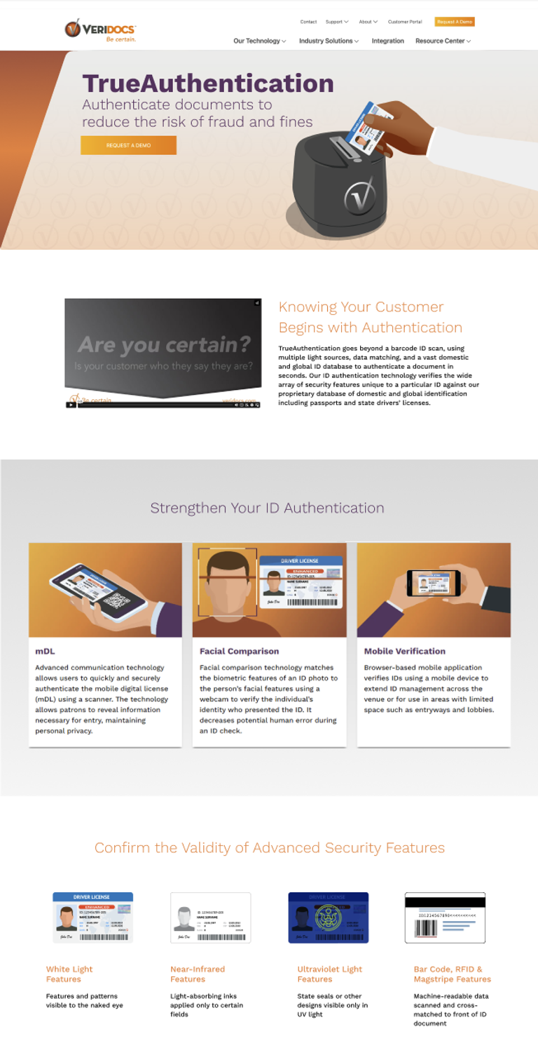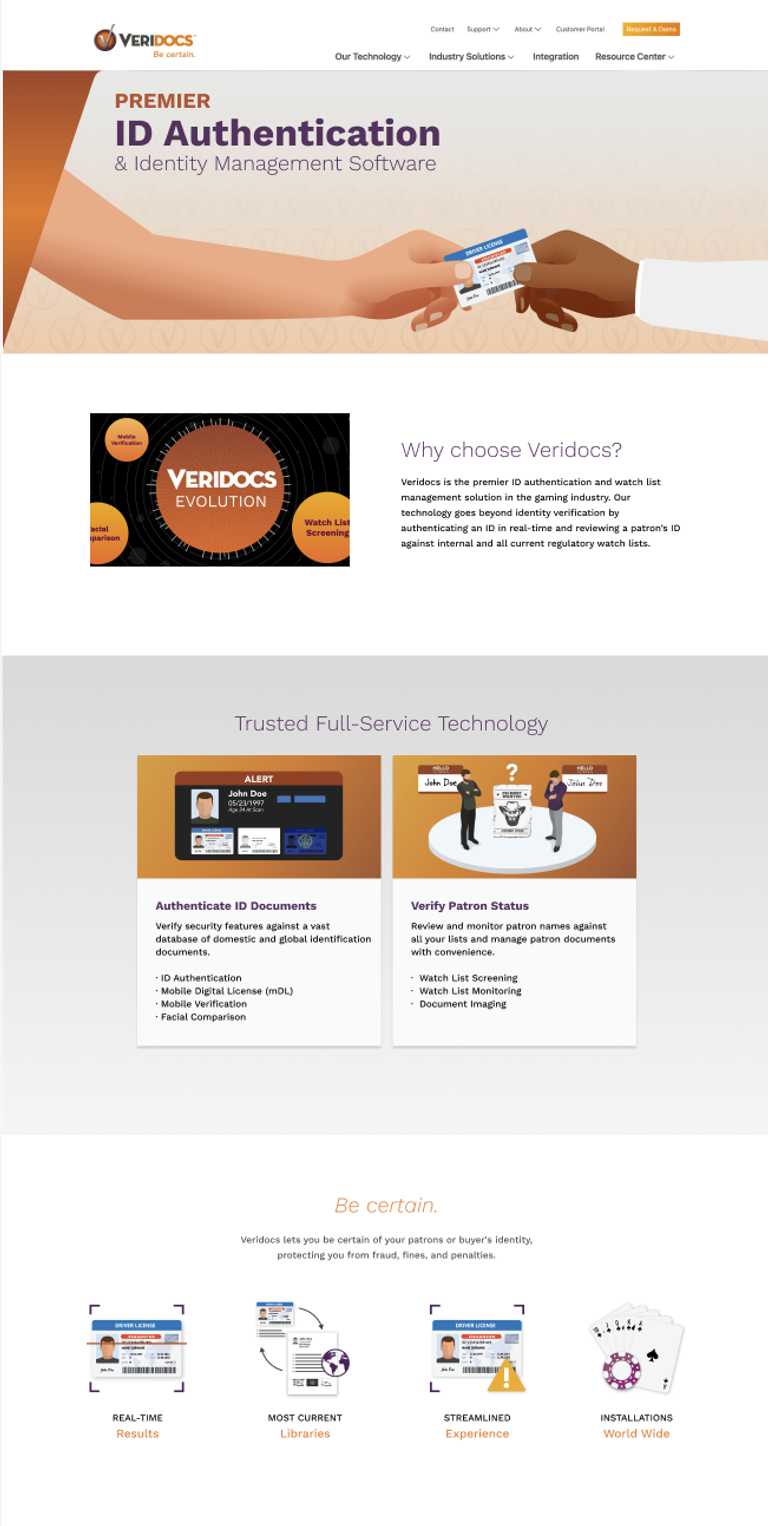 SCG’s proprietary research revealed the importance of certainty for users of Veridocs’ technology users, leading to the Be certain brand positioning. Product messaging and a custom website were developed with an information architecture that better spoke to both casino and integrator markets. Veridocs began to publish its expert insights on the site and in media publications.